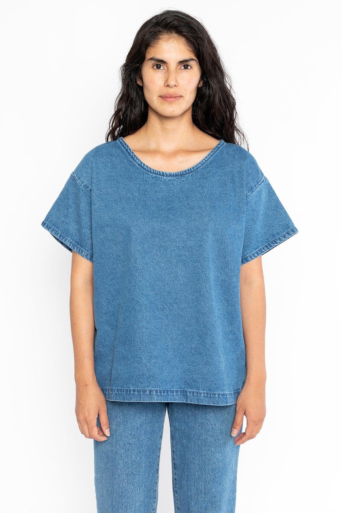 The Denim T-Shirt is constructed out of 10 oz denim and then dyed and treated with enzymes for a slight softening effect. The result is a workwear-inspired piece that’s functional and perfect in its simplicity. Features a slightly oversized, boxy fit with side seam vents at the hem. Wear this alone as a top or layer over long sleeves.