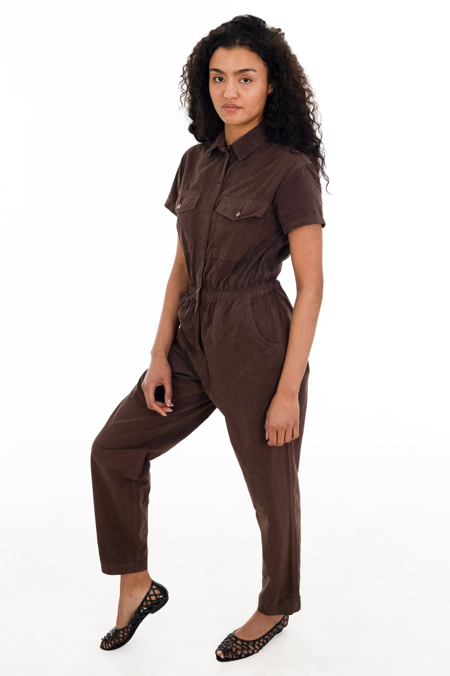 Our Short Sleeve Cotton Poplin Garment Dyed Jumpsuit is our version of the ultimate utilitarian jumpsuit. Made from a light and breathable, yet sturdy 100% cotton poplin, this garment can easily transition through seasons. This style has 2 front chest pockets, 2 waist pockets and a back pocket. A front zip opening makes this a style that can be easily taken on and off, as well as adjustable to reveal as much as you'd like. This jumpsuit is great for effortless styling that can be dressed up with heels or dressed down with sneakers. Garment Dyed and Made in the U.S.A.