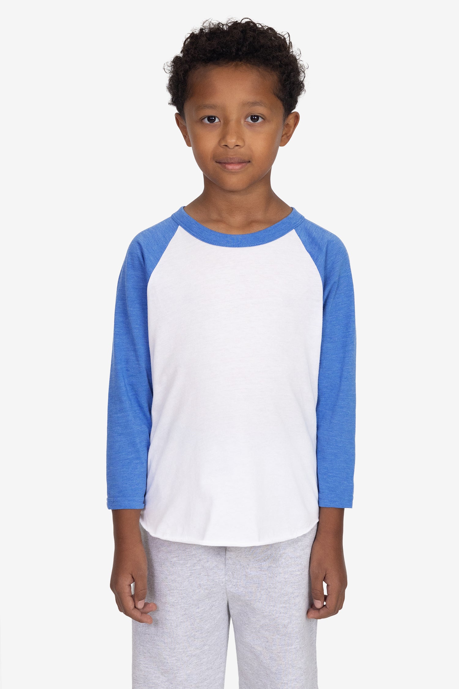 This classic unisex children's raglan is made from one of our bestselling, original textiles. Our 50/50 poly cotton is lightweight and versatile. This style features 3/4 length sleeves and a raw-finished hem.