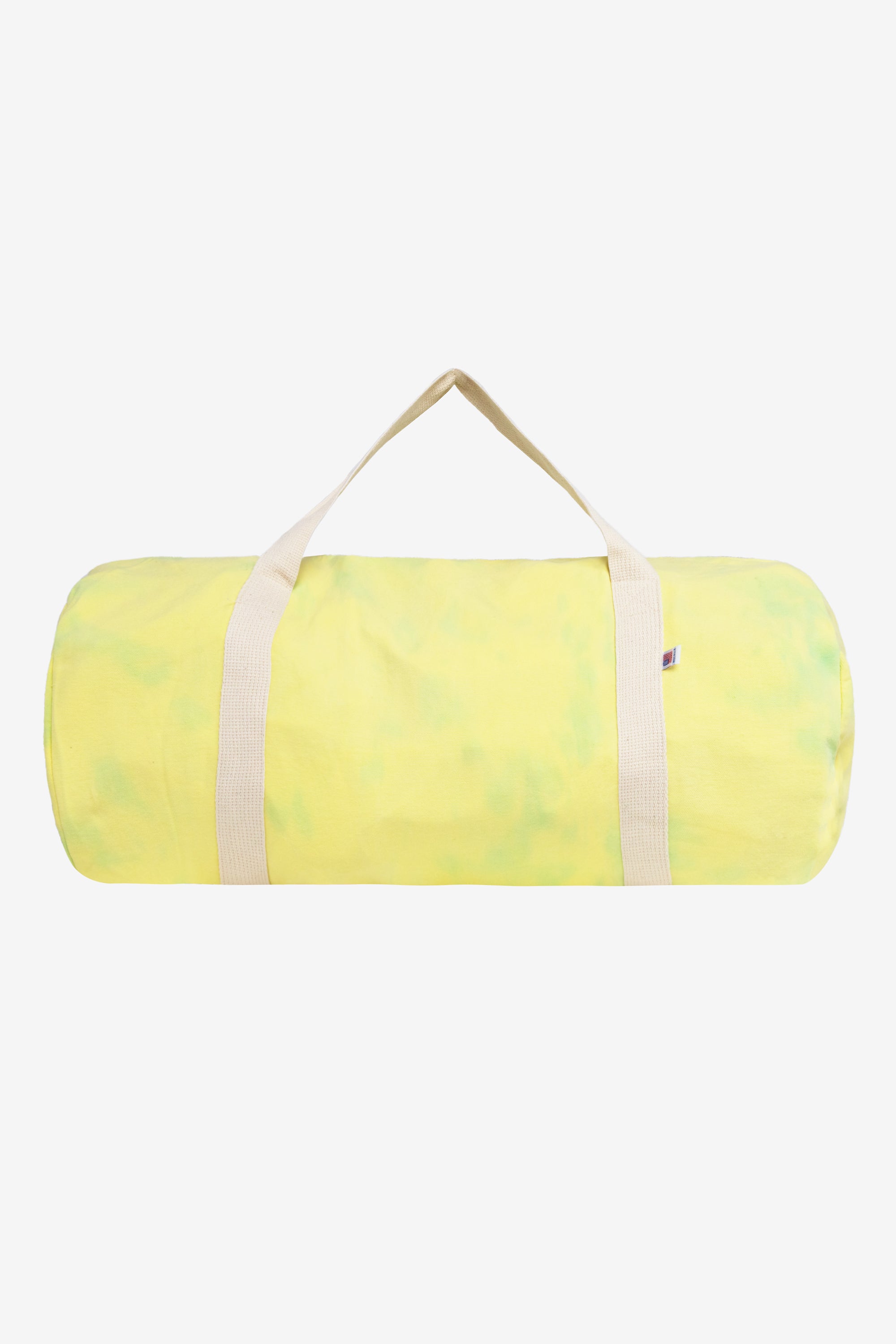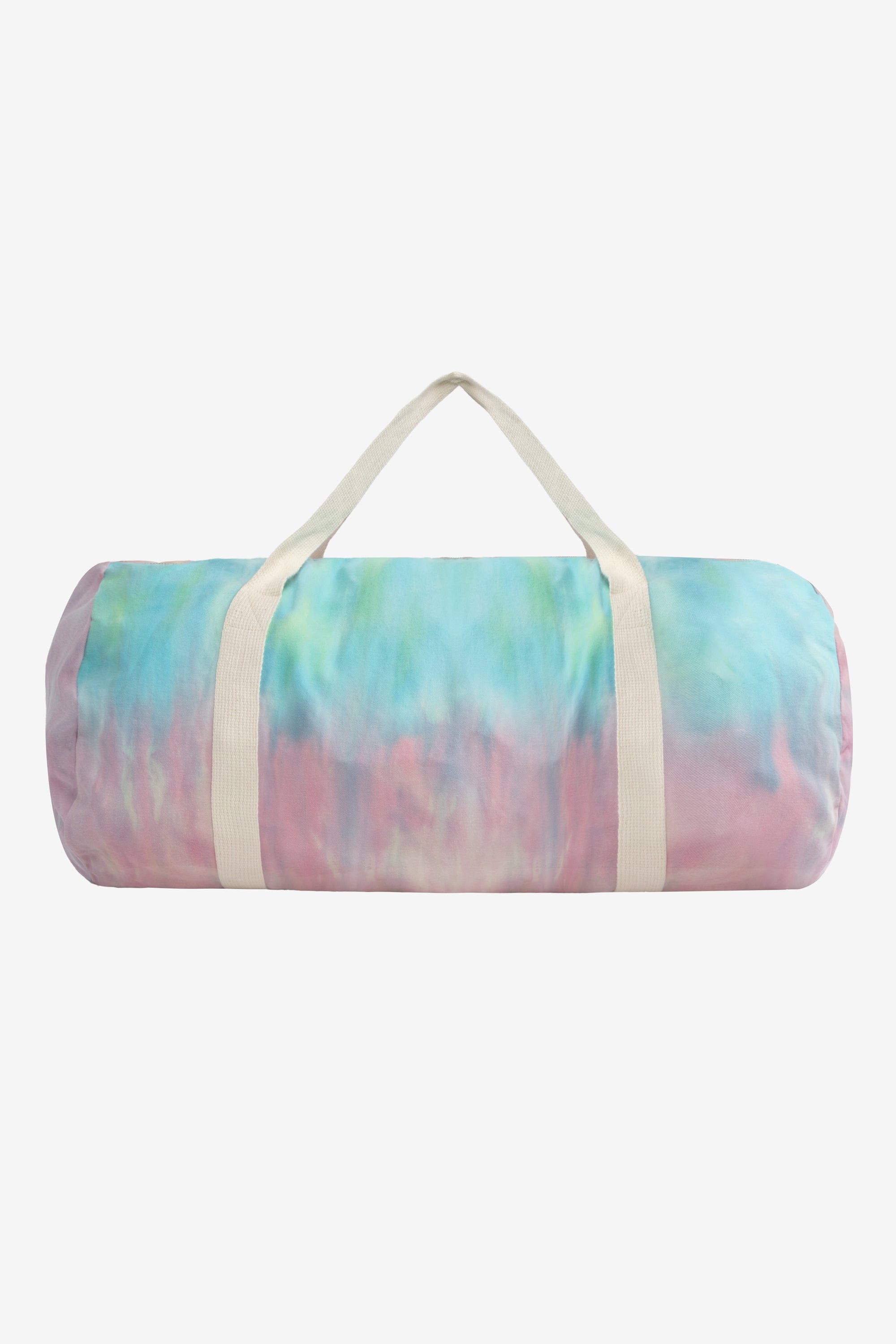 A fun duffel bag ideal for summer trips to the beach, yoga classes and picnics in the park available in subtle-yet-vibrant, tie-dyed canvas. This canvas bag is machine washable and features contrasting natural woven straps. This bag has a height of 13 1/2" and bottom width of 40" with versatile nylon webbing straps that fit comfortable in your hand or over your shoulder.