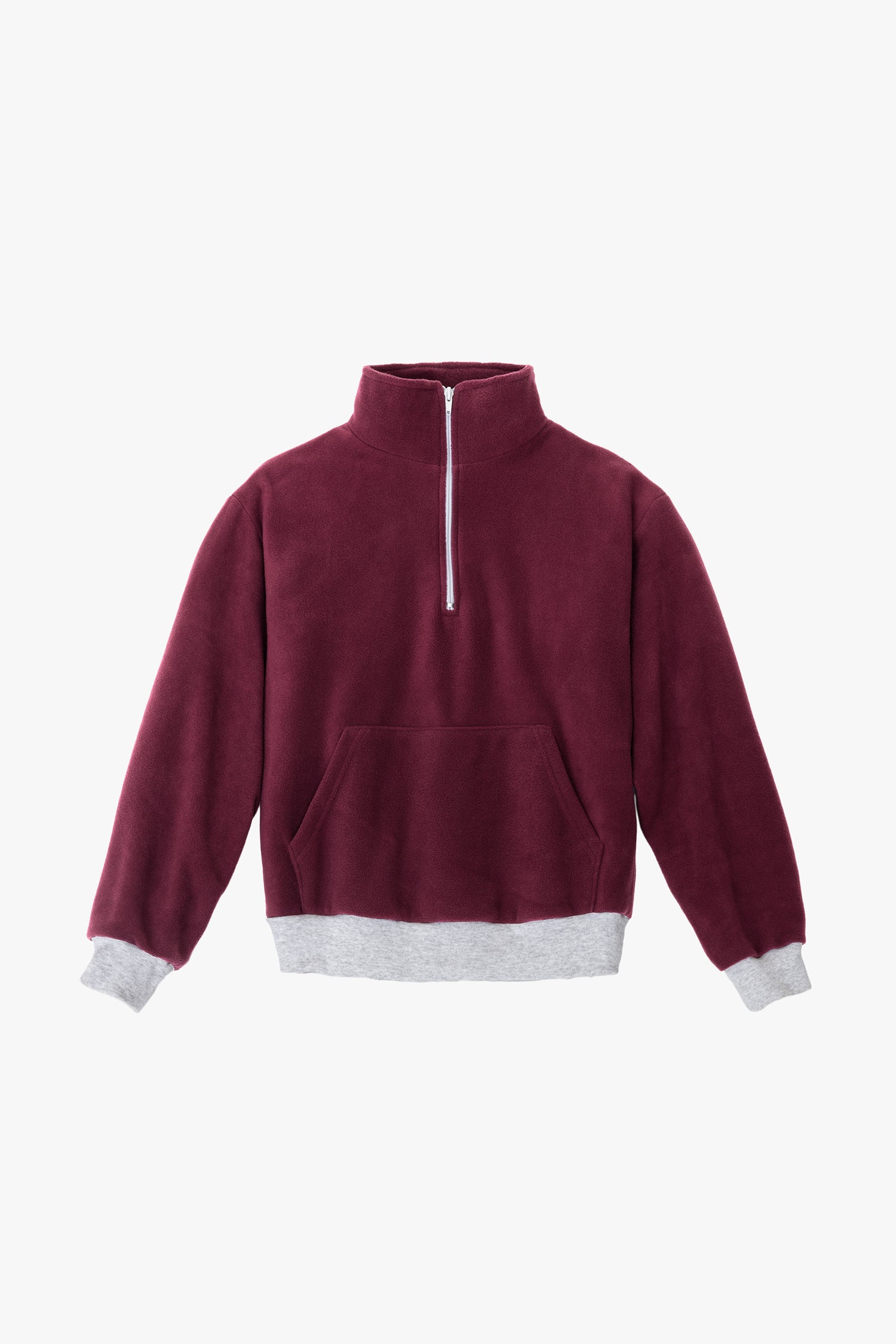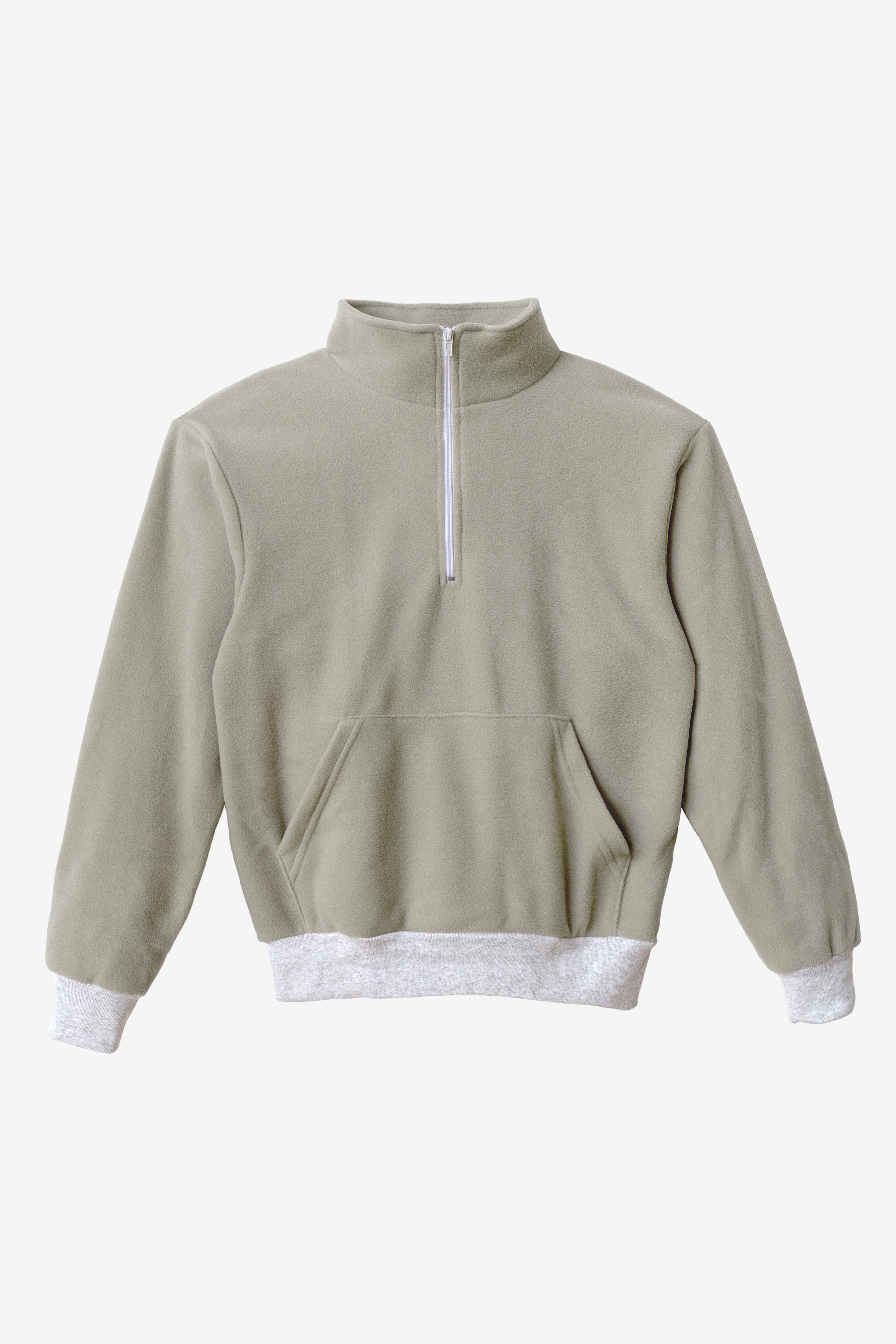 Introducing the Polar Fleece Half Zip. This unisex pullover features contrasting Ash rib around the cuffs and waistbands that pairs perfectly with our Heavy Fleece styles, a kangaroo front pocket, and this style can be worn zipped up or down. Casual and functional with a generous fit to the body and arms. Perfect for layering with our turtlenecks and sweatpants.